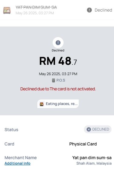 At first, I thought the card would work instantly without any extra steps. When I tried to pay for lunch at Yat Pan Dim Sum in Setia Alam, the transaction was rejected. It turned out the card wasn’t activated yet. I had to go home and complete the activation process in the Cypher app before I could use it.