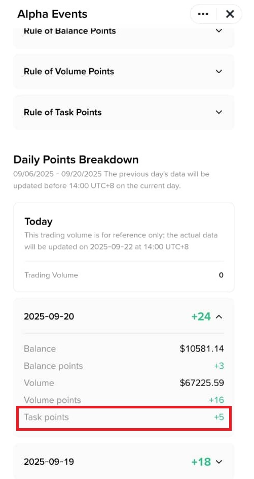 After your qualifying transaction, the 5 Alpha Points should arrive the next day. As you can see, the additional 5 task points will appear the next day at 2 PM in the Binance Alpha Events tab.